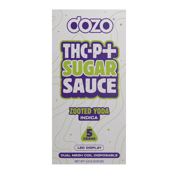 Vive una experiencia profunda de relajación y descanso corporal con el Dozo Sugar Sauce Zooted Yoda, un vape desechable de 5 gramos diseñado para quienes buscan desconexión total. Este dispositivo está formulado con una mezcla premium de THC-P, Delta-9, HHC, Delta-8, CBG, CBC y extractos terpénicos naturales de alta concentración (HTE), logrando un efecto índica envolvente y duradero.
