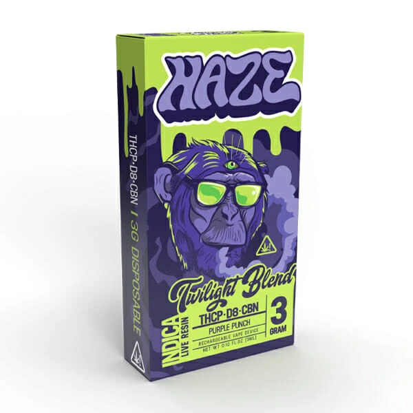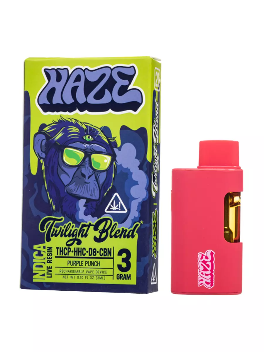 ¡Agárrense el sombrero, aventureros intergalácticos! Prepárense para que les vuele la cabeza la mezcla HAZE Twilight, una fantástica fusión de THCP, Delta 8 y CBN en un vaporizador desechable recargable de 3 gramos. Deléitese con las sabrosas aventuras de Purple Punch mientras se embarca en un viaje salvaje por el cosmos.